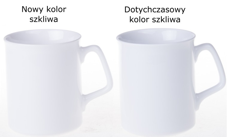 Wychodząc naprzeciw wysokim oczekiwaniom naszych Klientów, wprowadziliśmy nowy kolor szkliwa dla 5 popularnych fasonów naszych produktów. Nowe szkliwo są bielsze, wykonane z najlepszej jakości porcelany, a produkty stały się bardziej eleganckie, dzięki subtelnym, cienkim ściankom. Zmiana dotyczy fasonów: Opty, Jasmine, London, Star, Ole Set. Struktura oraz pozostałe parametry produktów nie uległy zmianie. Poniżej mają Państwo porównanie szkliw na przykładzie kubka LONDON.
