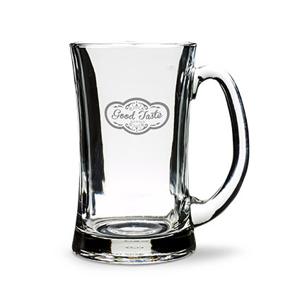 Masywny, wykonany z grubościennego szkła kufel do piwa z dużym uchwytem i rozszerzającymi się ku górze ściankami.