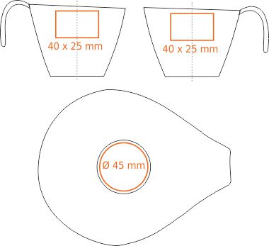 Nadruk wewnątrz (ścianka) (50x10 mm) Nadruk na dnie (wewn.) (ø30 mm) Nadruk na spodzie (zewn.) (ø35 mm) Nadruk na spodku (ø45 mm) Nadruk złotem Nadruk srebrem Nadruk przez rant Personalizacja |