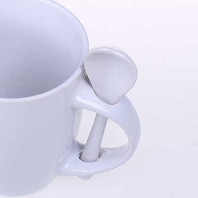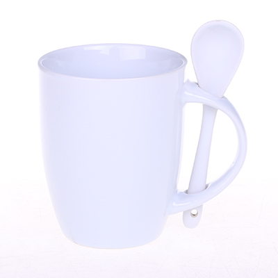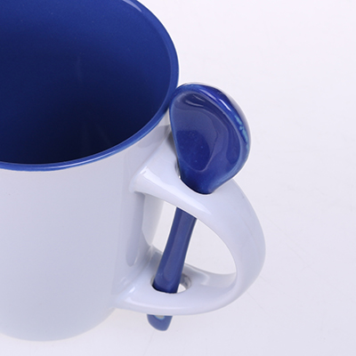 Kubek reklamowy z kolorowym wnętrzem i białym szkliwem na zewnątrz. W zestawie ceramiczna łyżeczka. Unikatowy kształt uchwytu ułatwia przechowywanie łyżeczki. Produkt jest końcówką serii, mogą na nim występować nakłucia, kropki oraz różnice w odcieniu szkliwa.